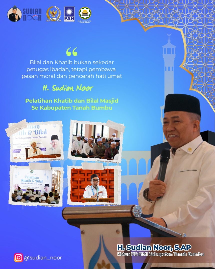 Batulicin – Ketua Dewan Masjid Indonesia (DMI) Kabupaten Tanah Bumbu, H. Sudian Noor, terus menunjukkan komitmennya dalam memperkuat peran masjid sebagai pusat aktivitas umat. Melalui DMI Tanah Bumbu, digelar Pelatihan Bilal dan Khatib Masjid se-Kabupaten Tanah Bumbu yang berlokasi di Masjid Ziyadatul Abrar, Pagatan, pada Rabu (22/10/2025)